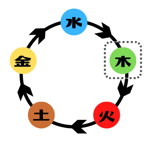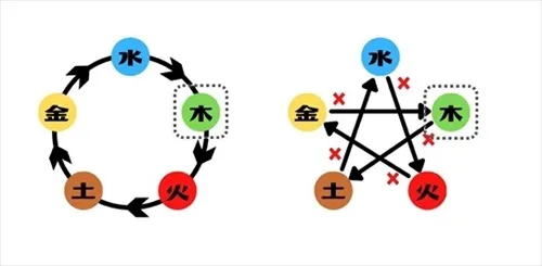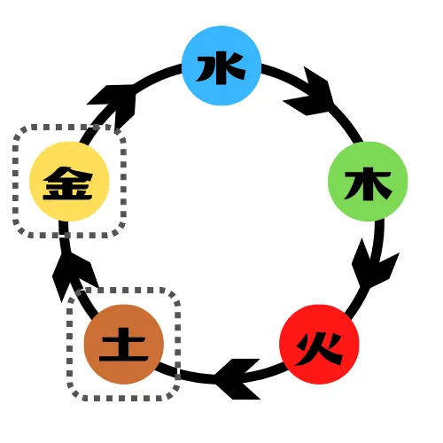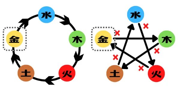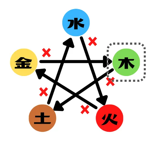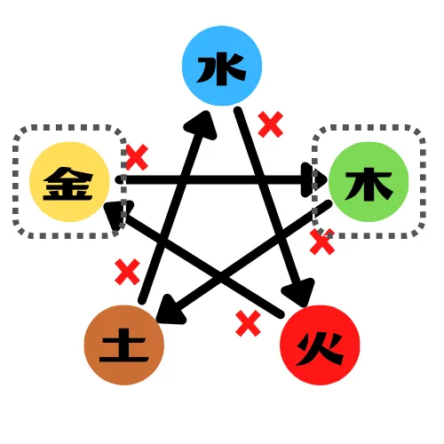 A.下の図の場合、金性が木性を抑えつける関係性です。この金性は、木性のコーチのような役割を果たすことになります。
