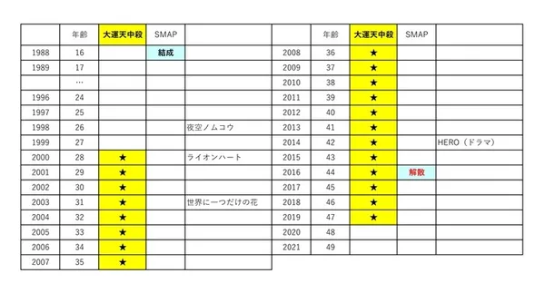 例として、キムタクの「大運天中殺」は、28~47才の20年間が、それに当たります。キムタクの若かりし頃の大活躍は誰もが知るところです。 こんな曲やドラマが流行ってました。・ 夜空ノムコウ 26才