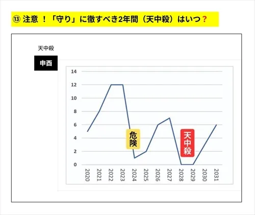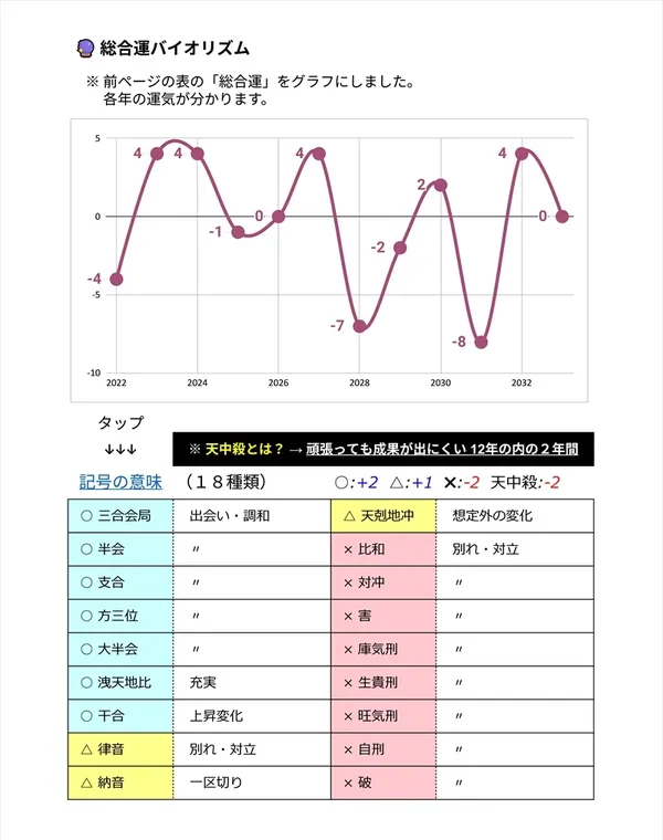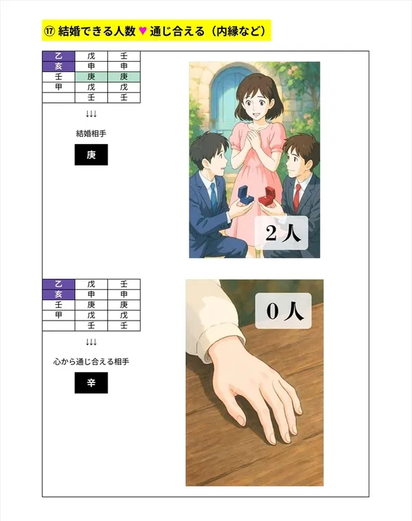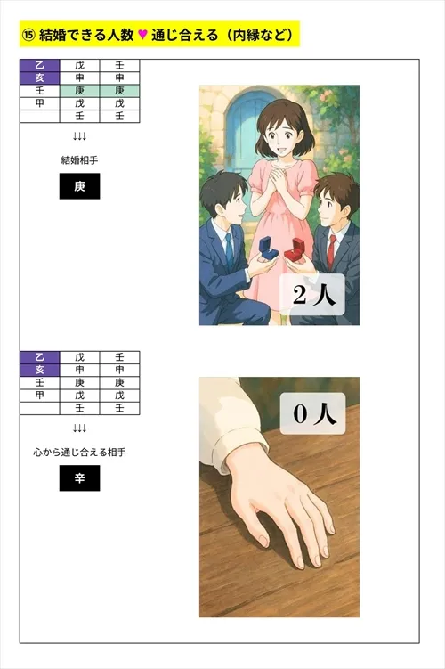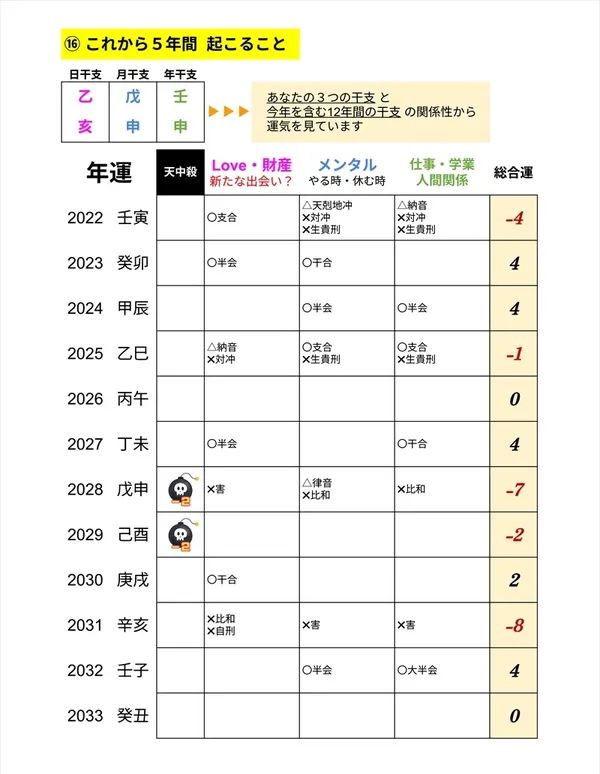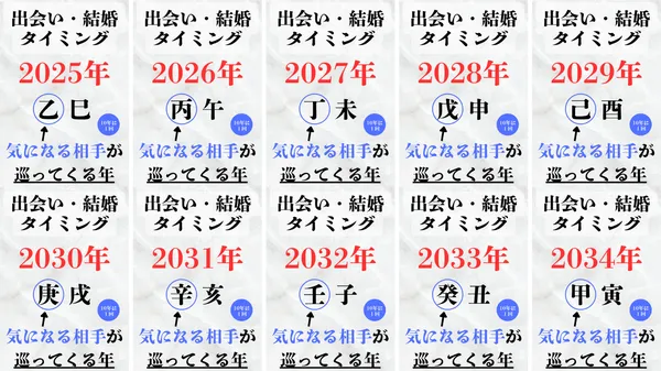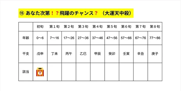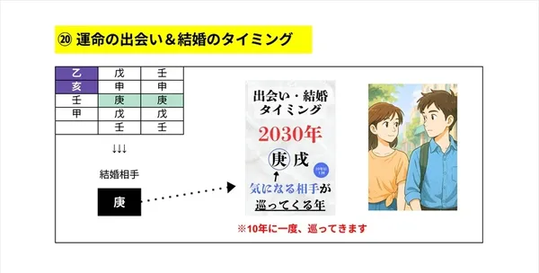 項目⑮の「結婚する人」が、10年に1回、回ってきた年が、異性に対して心がオープンになる1年ということになります。 この例では、結婚相手(結びつきの強い人)が「庚」ですので、2030年の1年間(立春~翌年の節分)がその年になります。↓↓↓