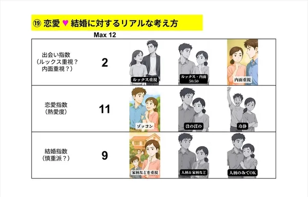 - 出会い指数 → ビビビッ!!一目ぼれ派?内面重視?