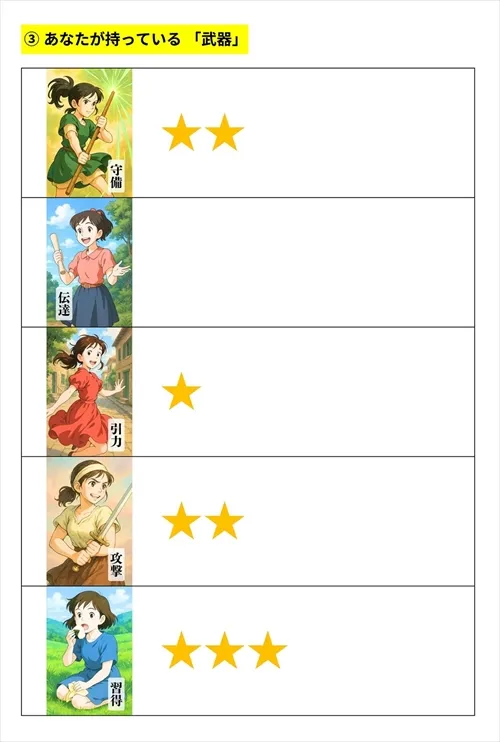 - 攻撃:攻める・挑戦する・発信で押し出す