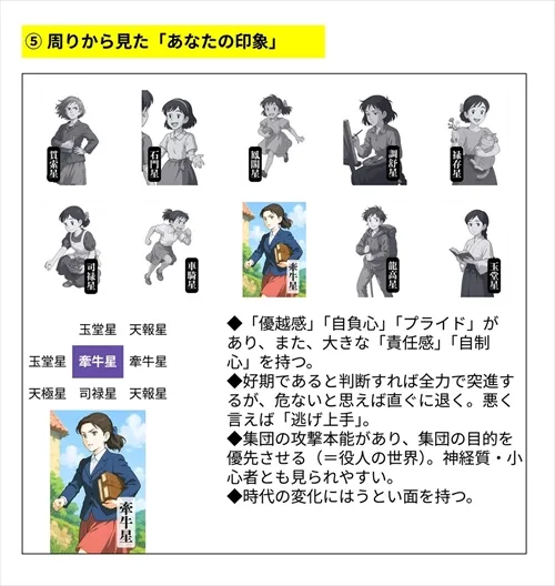 「木性」の女性であれば、自分から生み出される「火性」が「子ども」になるわけです。※男性の場合は、結婚相手(項目⑮)から生み出される性質の方が、お子さんになります。