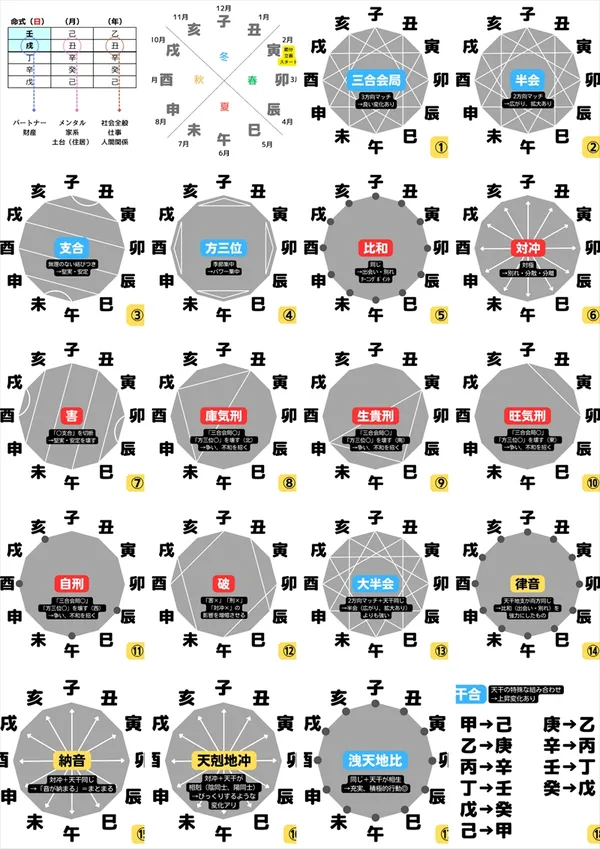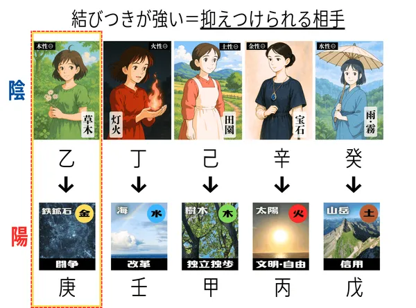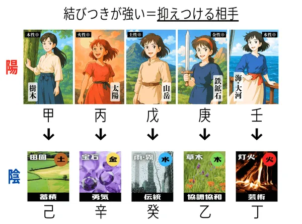 算命学では、結びつきの強い相手を「結婚相手」として考えています。5つの性質と陰陽の10種類があり、それぞれについて、”くっつき易い”パートナーが存在し、それを「干合」(かんごう)の相手と呼んでいます。